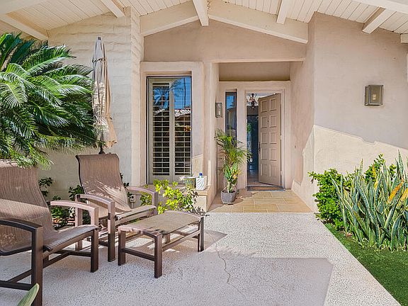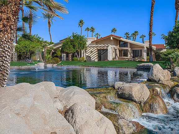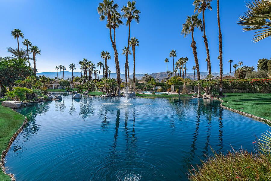 Hidden gem, centrally located in Palm Desert. Lago De Palmas consists of 12 homes surrounding a serine lake and community pool with beautiful mountain views. Three bedroom, three bath home with additional office and storage room (the golf cart garage was converted into a storage room). The home has been tastefully remodeled over the years with new flooring, kitchen, and bathrooms. The primary bedroom opens up to the side patio with lap pool and jacuzzi, master bath has dual walk-in closets, soaking tub, dual sinks, tiled shower and separate room for the toilet. All bedrooms are ensuite, There is an additional patio overlooking the lake, community pool and mountain views out from the breakfast room. The home is being offered furnished per inventory list, outside of escrow. Direct access to Monterey Country Club through the communities own private gate. Discounted golf at Desert Willow with Resident Card.