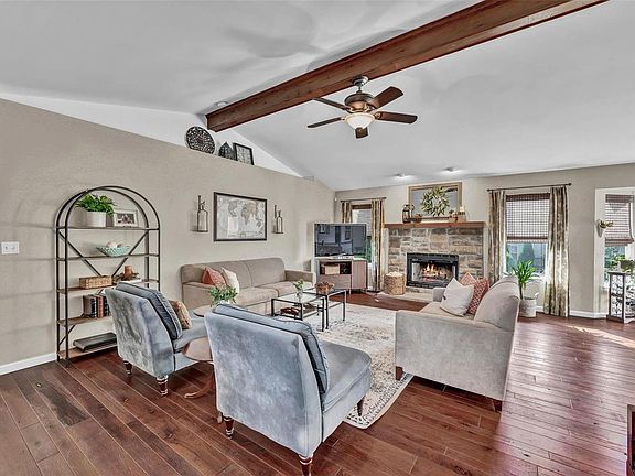 This beautiful ranch located on a private court has a fenced, level yard & finished lower level with a wet bar! Soaring vaulted ceilings & gorgeous hickory hardwood floors in the main living area, including the family room with a lovely stone fireplace, breakfast room w/bay sliding door opening to the oversized patio, & spacious kitchen featuring crisp white cabinets w/roll-out trays, gorgeous lighting, subway tile backsplash, & stainless steel appliances, including a 5-burner gas range. Tall vaulted ceilings in the primary suite as well, w/walk-in closet & private bath w/soaking tub & separate shower. Handy main floor laundry. Valuable additional living space in the lower level rec rom w/full bath & space for a home office/playroom & home gym. Recently updated roof & HVAC. Lovely landscaped yard includes a storage shed. Oversized garage w/7' bump out. Easy access to I-70/364/64 & wonderful shopping, dining, & conveniences. Ft Zumwalt (West High) Schools. Stunning home! See it today!