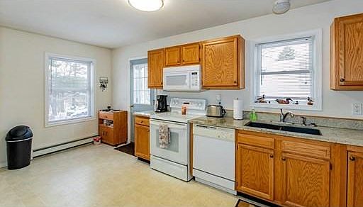 Young 3-4 BR well-maintained raised ranch with a WATER VIEW! and access to Webster Lake for swimming! is move-in ready. Sunny eat-in kitchen with granite counters, includes appliances, separate dining area. Three bedrooms upstairs with ample closet space. Large master BR with bath and double closet. Downstairs, just a little finish work and some carpet will add a playroom or family room. Additional office or bedroom (with closet) in basement. Plumbed for another bathroom in the basement. Well pump 7 years old. Garage under. Easy yard to maintain. Town sewer. Close to highways, great commuter location. Near Indian Ranch, you can hear the summer concerts from the house. Water access is a plus. No dock, but access to the water for swimming, kayaking, etc. Showings start December 26th, open house Sunday 12-2 on December 27.