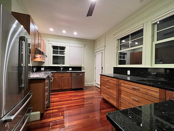 Beautifully renovated 3 bedroom 2 bathroom 2 kitchen unit in a two-family home in Spring Hill. This first floor unit spans 2 floors (1st and ground floor) and features newly refinished hardwood floors, central air, recessed lighting, living room, dining room, extra room/office space, and a renovated eat-in kitchen with custom cabinets, granite counter tops, stainless appliances including dishwasher, disposal, gas range, and refrigerator. Laundry is conveniently located in unit. The ground floor features 2 bedrooms, a second kitchen with granite counter tops, dishwasher, and electric stove, living/recreational area, and a renovated bathroom with whirlpool tub. Garage parking is included. Back porch and shared yard space. Amazing location between Porter and Union Square with easy access to the red line and the green line. (Reference #139678) Available Now. Garage parking included. Pets are negotiable.