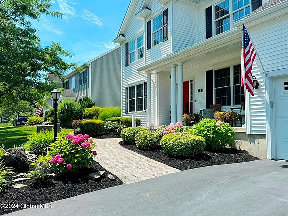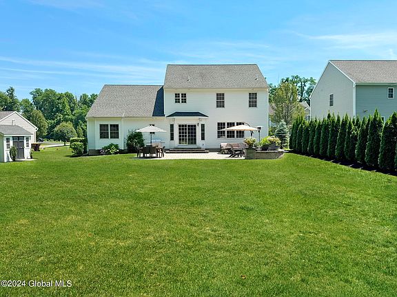 Spectacular 5 BR, 3 Full BA colonial w/ a 2 car garage on a private, .52 ac lot on a cul-de-sac street in East Greenbush minutes to shopping, restaurants & highways! Outside offers beautiful landscaping, a shed & play set, & a newer spacious patio w/ step lighting & a firepit. Features HW floors through the main living areas on 1st flr including newer HW in the office w/ French doors. LR w/ gas FP & built-ins. 1st Fl BR 5 & full BA is perfect for guests! Primary BR w/ 2 walk-in closets & spacious full BA w/ shower & separate tub. Nat gas hot air heat & A/C just serviced; vinyl siding power washed & gutters cleaned 7/24. Garage updates include gas heater w/ Nest thermostat & EV charger. Andersen wood dble pane, tilt-in windows with interior glare & UV protection tinting added in 2018.