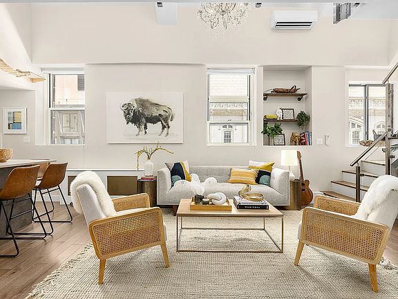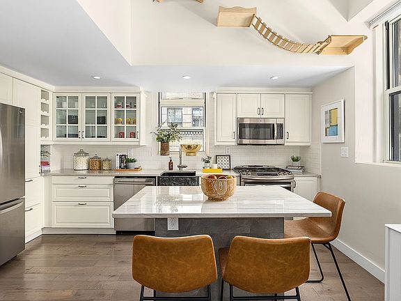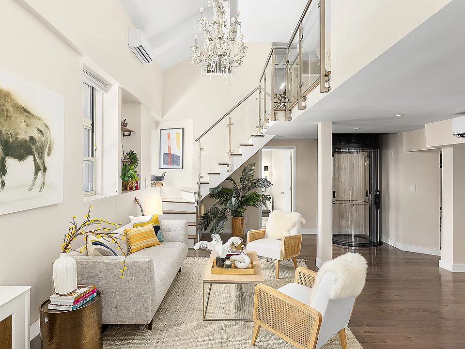 Dreamy Designer "Treehouse" Triplex w/Rooftop Terrace. Available for the first time ever. Introducing the most unique home in Gramercy, a one-of-a-kind combination triplex that has undergone a meticulous years-long renovation to create a special, dream-like escape in the heart of Manhattan. Between a custom see-through elevator and a beautiful spiral staircase, residents have two portal-like entry points that transport them to their ultra-private penthouse sanctuary. This 3-bedroom, 3-bathroom corner apartment knits together a grand entertainment space with a collection of cozy nooks and secluded retreats. It also comes with dedicated office space and a private rooftop terrace. On the FIRST FLOOR is a huge open plan living, dining, and kitchen area with vaulted double-height ceilings and a trio of oversized windows that let in an abundance of natural light. The windowed kitchen is adorned with an eat-in island, sleek quartzite countertops, a handmade subway tile backsplash, a stone farmhouse sink, custom cabinets, and a suite of stainless steel appliances. In its own private wing separate from the living space, the quiet primary suite has a walk-through closet with custom built-ins and a pristine en-suite bathroom with mosaic marble tile floors, a chic vanity with double LED vanity mirrors, and a deep tub with a glass shower partition. Finishing the first floor are storage closets, a wet bar, a lovely full bathroom with stone shower featuring original exposed ceilings and a service entrance. A modern staircase with steel and glass railing leads up to a SECOND FLOOR landing overlooking the living area below. A split-wing layout ensures both bedrooms maintain privacy while sharing easy access to an elegant full bathroom with custom marble tilework and a deep tub. Each bedroom has custom built-in storage, one has a unique reading nook and the other has a gorgeous skylight. The THIRD FLOOR is a private rooftop terrace offering stunning skyline views. It is the perfect setting for hosting guests, enjoying alfresco dining, sun lounging, outdoor yoga, urban gardening, and more. The home has mini-split heating and cooling systems in every room and a windowed bonus room with a private entrance that can easily be used as a home office, fitness studio, bedroom, den, or gallery. Built in 1912, The Sage House is a landmarked pre-war co-op located a block from Gramercy Park. The building has a regal sandstone façade, full-time door attendants, a live-in super, common laundry, a bicycle room, and private storage. It is moments from Madison Square Park, Union Square, Eataly, Flatiron, NoMad, and dozens of the best restaurants, bars, and cafes. Accessible subway lines include the 4, 5, 6, L, N, Q, R, W. Co-purchasing, parents purchasing for employed children, gifting, pets and pieds-a-terre are welcome. Plus, unlimited subletting (with Board approval) is allowed after 1-year of ownership and 80% financing allowed.