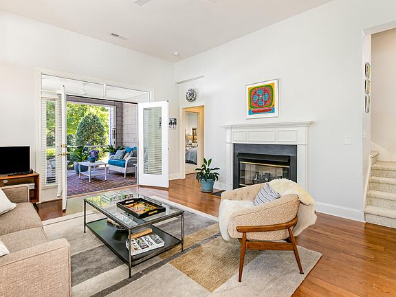 Nestled in Camden South, one of Fearrington Village's most desirable neighborhoods, you will find this charming home with privacy, views and convenience! For 20 years, there have only been two owners who meticulously maintained this property. Flooded with sunlight from South, East, North, and West facing windows. The larger than usual Camden lot is a gardener's delight with lovely flowering trees; songbirds, hummingbirds and butterflies abound. Family room with fireplace and high ceiling has French doors that open to a screened porch with a view of the manicured yard that is maintained by the HOA, and there is a peaceful view of the protected woods. Separate dining area. Hardwood flooring in family room, dining room and kitchen. Kitchen with island has updated (2020-2024) dishwasher, refrigerator and Thermador cooktop. Glass doors open from the kitchen to a courtyard garden with a water feature and garden with many perennials and other unique plantings. Separate laundry room with premium LG washer and dryer, both on back-saving pedestals (new in 2020). Main-level primary suite with built-in shelving and desk. Primary bath features a tile shower and Kohler Purist plumbing fixtures and knobs/pulls. Upstairs there are two spacious bedrooms and a full bathroom. Two-car garage with built-ins. Rainbird irrigation system. Recent updates include new Berber carpet in primary bedroom and upstairs, new water heater (2019), new toilets, Hunter Douglas Powerview electric blinds in the primary suite and kitchen, new Trane air conditioning for second floor, and surge protectors for both air conditioning units. Camden South is an easy walk to the village shops, farmers' market and the swim club. The friendly, close-knit residents of Camden South enjoy monthly gatherings.