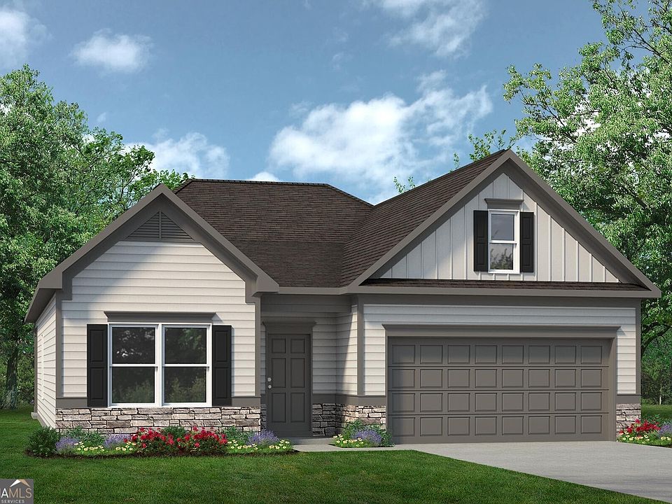 Move in Ready October! The Langford plan in Laurel Ridge by Smith Douglas Homes. This flexible single-level living floorplan offers a light-filled dining area with views of the backyard and access to a covered patio from the main living area. An adjacent open island kitchen which features upgraded cabinetry, a tile backsplash and granite counters overlooks the spacious family room with a modern linear fireplace. The primary suite, at the back of the home, feels private with its spa like bath with a garden tub, separate shower and walk-in closet. A covered back patio can be accessed through the family room. The two secondary bedrooms and shared full bath are off the main foyer at the front of the home. A conveniently located laundry room enhances everyday living. The nine ft ceiling height enhances the space as does the Vinyl plank flooring throughout the main living areas. Photos are representative of plan not of actual home being built. Seller incentives with the use of preferred lender.
