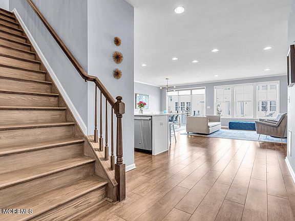 Welcome to the impeccable Davidson model in the highly sought-after Four Ponds at Lincroft! This stunning 3-bedroom, 2.5-bath home offers modern elegance and thoughtful design throughout. The spacious open-concept first floor boasts soaring 9' ceilings, recessed lighting throughout, engineered laminate flooring, and a grand living room with custom moldings, perfect for relaxing or entertaining. The chef's kitchen is a masterpiece, featuring an oversized center island, high-end stainless steel appliances, beautifully crafted cabinetry, and sleek quartz countertops. A bright dining area with sliding glass doors opens to a beautifully appointed outdoor patio, ideal for gatherings and alfresco dining. Upstairs, the luxurious primary suite features a tray ceiling, recessed lighting, a custom walk-in closet, and a spa-like bath with a double vanity and a glass-enclosed shower. The two additional spacious bedrooms also include custom closets, providing ample storage and organization. A versatile loft/office space and a laundry room with custom organizers complete this level. The fully finished basement provides an incredible bonus space ideal for a media room, playroom, or home gym while still offering ample storage. A spacious two-car garage ensures convenience with plenty of room for vehicles and additional storage. Nestled in a prime location within walking distance to the community gym and pool, this home offers resort-style living with scenic walking trails, a playground, and a stunning clubhouse. Ideally situated near NYC transportation, major highways, parks, shopping, dining, entertainment, and the breathtaking Jersey Shore beaches this is a rare opportunity to own a home that perfectly blends luxury, comfort, and convenience!