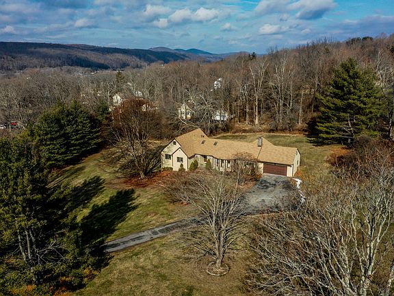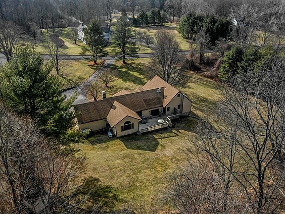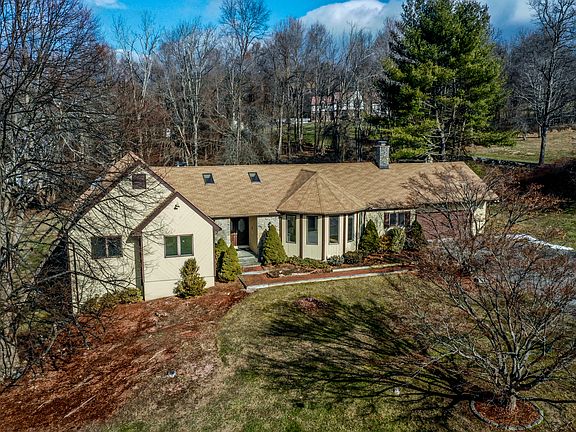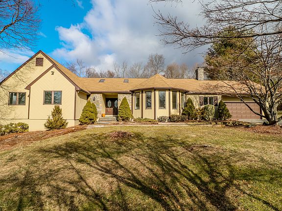 Located in a desirable neighborhood on 2.35 level acres, this is truly a home of distinction. The appealing Ranch design with the ease of one level living also features many updates and Contemporary accents throughout. Double front doors open to a large foyer leading to spacious rooms w/polished hardwood floors, soaring ceilings & skylights. The floorplan promotes comfortable living and memorable entertaining. A step-down formal living room has oversized sliders to an expansive deck and flows to the formal dining room. Steps away is the light filled eat-in kitchen with Corian counters, new backsplash, island w/cooktop, double wall ovens, Sub-Zero refrigerator, tile floor, & laundry/mudroom with easy garage access. Focal points in the spectacular family room include cathedral ceiling, Palladian window, sliders to deck, and a seating area w/floor to ceiling stone fireplace with marble hearth & custom built-in sofa. All bedrooms have new wall to wall carpeting. Cedar walk-in hall closet. Updated full bath. Luxurious master bedroom has a full bath, double vanity, frameless rain & waterfall shower; walk-in closet; and private entrance to deck and yard. A walk-out unfinished basement offers unlimited storage or the potential for additional living space.