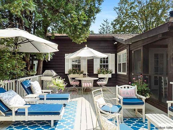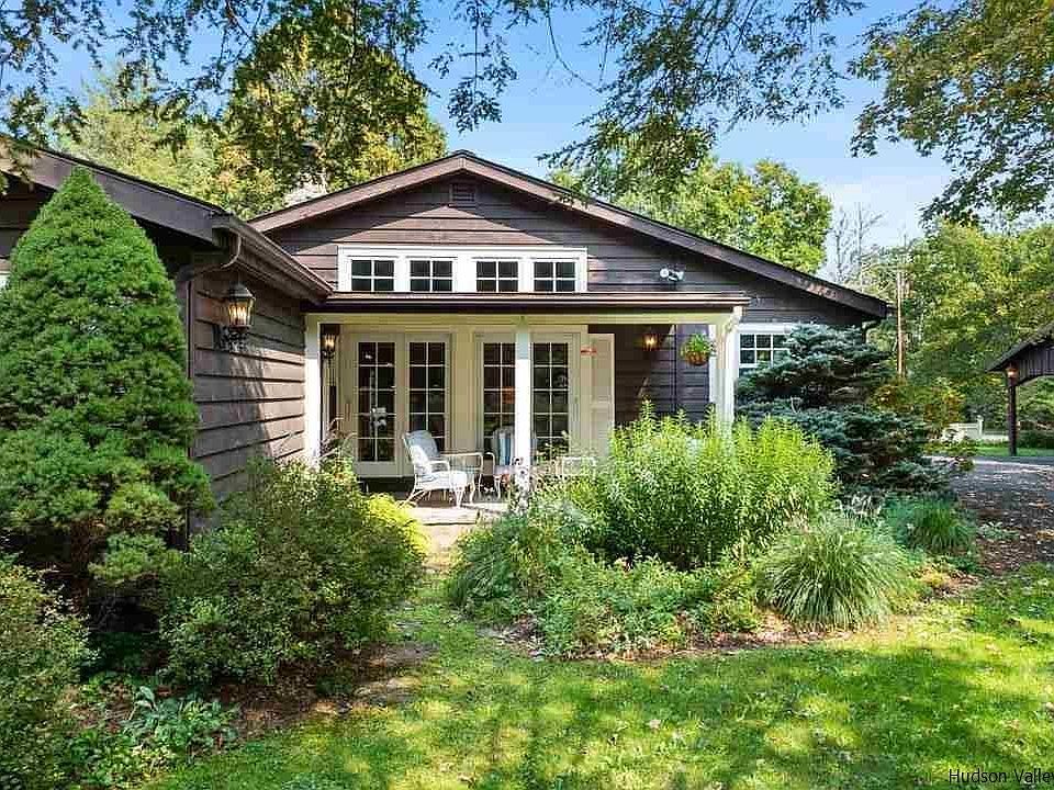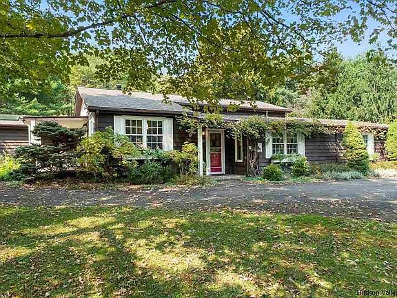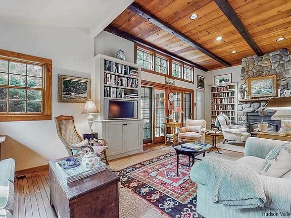 Never before on the market, this lovely Woodstock home is a perfect blend of Catskills warmth, elegance, luxury and old world charm. Designed and expanded over the years with elements of the Byrdcliffe Art Colony's unique style, the owners and their architect have made a true paradise both inside and out. The high beamed ceilings in the living room are accented by the stone fireplace and transom windows allowing for abundant light in all seasons. A step out from there is a charming covered bluestone patio - one of the many outdoor spaces throughout the property for entertaining or to curl up with a book. The kitchen and adjacent open dining area have custom handcrafted cabinetry to accommodate storage and serving needs for an intimate dinner or entertaining a crowd. From there, head on out to a charming and large screened in porch and expansive deck to spend days or nights from Spring through Fall and beyond. Private and fenced in, the grounds feature a large in-ground, saline and heated pool with bluestone decking and lights both underwater and throughout the exterior for night time fun. A super luxe pool house/cabana has a cathedral ceiling with fan and lights, sink and refrigerator as well as a lighted dressing room with shelves and a private covered outdoor shower. The primary bedroom and an additional bedroom (also suitable for an office) are located in the West wing of the home which was added in 2007. Bathed in natural light, it has custom cabinetry and French sliders out to another bluestone patio overlooking the gardens and pool. Updated and spacious, the en suite bathroom has luxurious appointments: A steam shower, separate physician designed "Bain Ultra Thermo Masseur Air Bath" with chromotherapy lighting, and double sinks with Carrara marble countertops. There are 2 additional "wings" from each direction of the main living spaces. A hallway leading from the kitchen/dining area hosts an office and a bedroom which is quite large with a spacious sitting area. A full bath serves both rooms. The East wing built in 2002 includes a family room/den, 2 more bedrooms and another full bath. These bedrooms each have French sliders out to interconnected decking which leads to the pool area and 3rd guest bedroom. Although the square footage of this home is not huge, it feels so much bigger due to the separate wings. Privacy abounds for everyone in this floor plan - even with a full house. One level living at its finest. The location is ideal, only 15 minutes to Kingston and the Thruway, 8 minutes to Woodstock, 15 minutes to Saugerties. Both the Woodstock Day School and Hudson Valley Sudbury School are within 6 minutes. Green Heron Horse Farm and Woodstock Tennis Club within 5 minutes. Woodstock Golf Club within 7 minutes. Skiing, hiking, water sports all close by! The home and its landscaping have been carefully curated and meticulously cared for since 1972 and it really shows. It is a gracious and very comfortable country home which has hosted over the years The Woodstock Byrdcliffe Guild House Tour, Woodstock Playhouse Garden Tour, Woodstock Artists' Association & Museum Art Tour and Fundraiser.