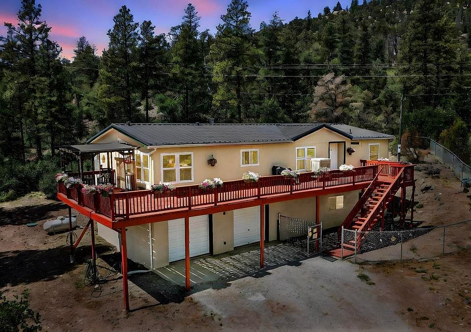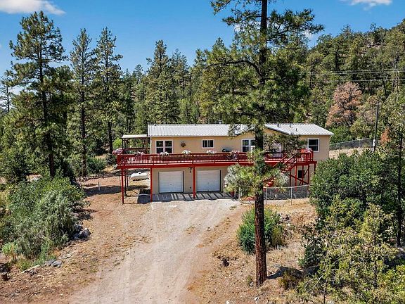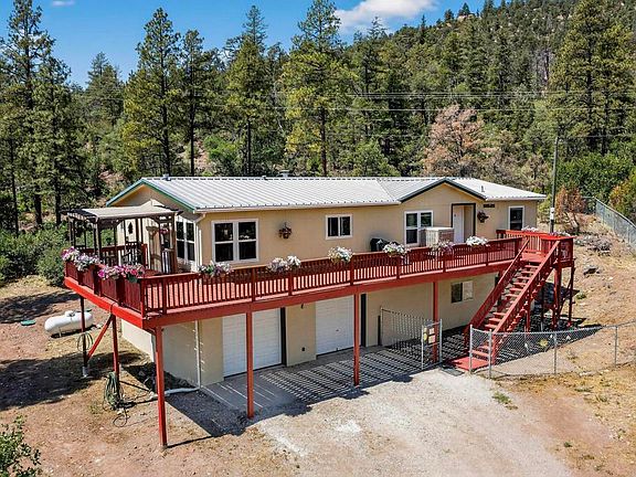 Welcome to Jemez, where fresh air, pine views & relaxed lifestyle await. This 5BD/3BA retreat w/ 3 living areas offers room for hobbies, home office, or rental income potential. Main level features a cheerful living room w/ fireplace, a country kitchen & 2 full baths serving three bedrooms. Step onto the freshly re-stained deck w/ pergola, your stage for sunrise coffee & sunset dinners. The lower level, structurally engineered & custom-built to support the home & deck, has its own entrance w/ 2 bedrooms, 2 living areas & a 3/4 bath, ideal as a 2nd suite, guest wing or private rental. Oversized garage stores vehicles & gear. A 1/2-acre corral w/ feed shed is ready for horses or animals, open space to expand. Fresh paint, new sinks, updated windows & new septic make this place move-in ready!