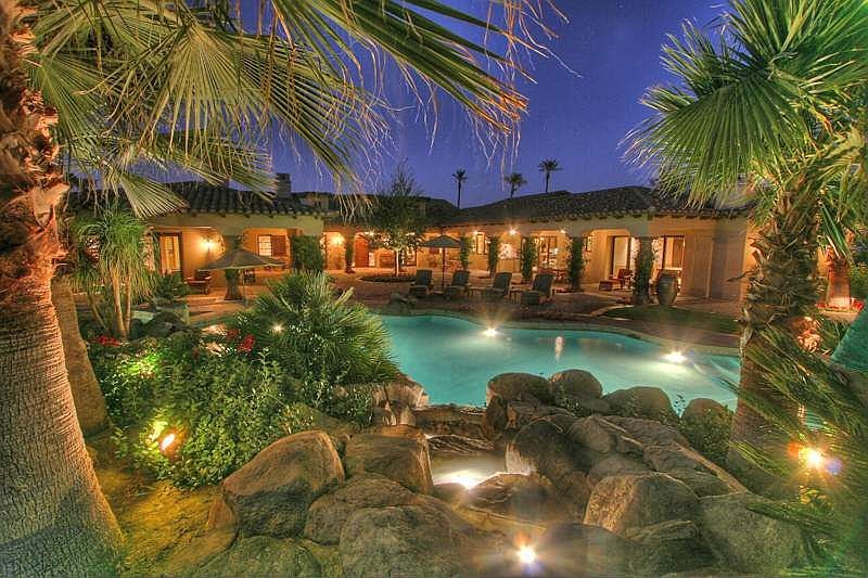 Clancy Lane- this is your opportunity to own a premier estate in one of the valleys top guard gated enclaves. This old world Hacienda style, 5 bedroom, 5.5 baths, 7252 sq.ft. one acre, compound appears to have been crafted over the centuries. However it was recently completed by one of the Deserts finest builders as their personal residence, incorporating top quality, state of the art materials and technology. The chef-ready kitchen has the best of the best appliances, stones and fixtures and has a spacious island perfect for entertaining. The cozy pool room has a walk-in wine cellar, two flat screen tv.s, bar, full bath and fireplace. A detached 2 room self contained guest casita, with kitchenette and washer and dryer provides a special retreat for guests. Walls of glass disappear revealing wraparound mountain views that take your breath away. Outside, large verandas, lush landscaping and cobbled patios surround the resort-style waterfall pool and spa. All this and a 6 car garage!
