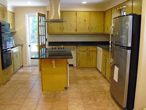 Formal dining room opens to large eat in country kitchen with granite and island.