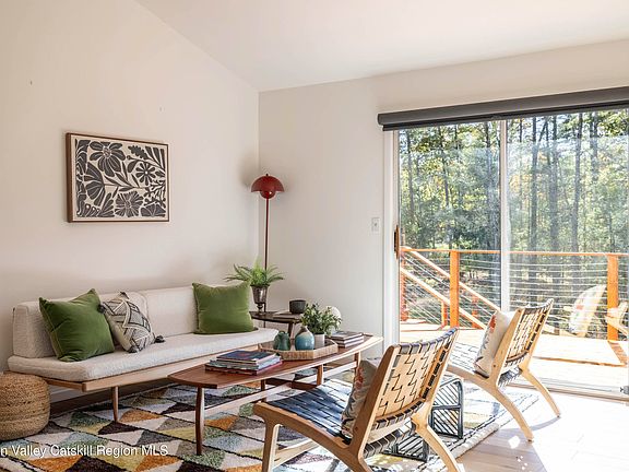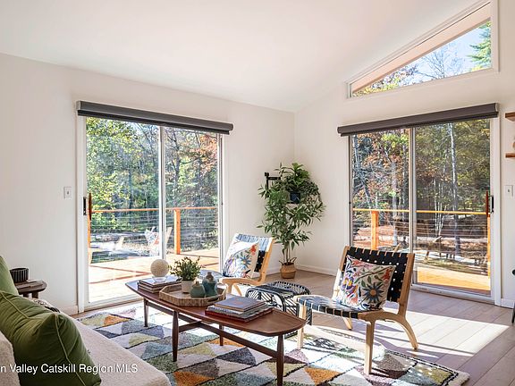 Highwoods Haven rests on just over two quiet acres where sunlight filters through tall hardwoods and birdsong fills the air. Although the setting feels miles from anywhere, the property lies barely five minutes from Woodstock's Village Green and within a short, scenic drive of Kingston and Saugerties. A comprehensive 2021 renovation infused the four-bedroom, two-bath residence with modern comfort while preserving its artistic soul. Former owner and Woodstock author Helen Weaver once welcomed Jack Kerouac, Allen Ginsberg, and other luminaries beneath this very roof. Step through the front door and an airy great room unfolds - chef's kitchen, dining area, and living space flowing together beneath vaulted ceilings. Four glass sliders invite daylight to wander inside, then open wide to an expansive wrap-around deck and a deep screened porch. Mornings begin with coffee among the treetops, afternoons drift into alfresco lunches in summer shade, and evenings conclude with cocktails under a sky alive with stars. Inside, rich oak floors and understated finishes lend warmth without distraction, allowing the surrounding landscape to remain the home's quiet centerpiece. The bi-level layout is thoughtfully conceived for flexibility and privacy. Upstairs, a generous primary suite accommodates a king bed; one enjoys the romance of a wood-burning fireplace that casts a golden glow on winter evenings. A spa-style bath, finished in polished stone and brushed brass, serves this level with a deep soaking tub that invites an unhurried exhale. On the main floor, two additional bedrooms offer space for guests or a dedicated office, sharing a crisp, contemporary bath that echoes the home's calm aesthetic. Downstairs, a second living area gathers friends around a vintage cast-iron stove whose gentle heat amplifies the invitation to linger over movies or board games when snow drifts beyond the windows. There is a second primary suite bedroom with a bath, allowing guests to choose which floor to rest on. Comfort is engineered into every detail: a high-efficiency heat-pump system installed in 2023 provides room-by-room climate control; a brand-new well delivers excellent pressure; and smart-home technology allows you to adjust temperature or lighting from anywhere in the world. Life at Highwoods Haven extends well beyond its walls. Three minutes down the lane, members-only Zena Recreation Club offers a pool, tennis courts, and year-round community events. Trailheads leading to hidden waterfalls, glass-clear swimming holes, and protected nature preserves lace the surrounding hills. At the same time, farm-to-table restaurants, galleries, and live-music venues sustain Woodstock's legendary creative heartbeat. Rhinecliff Amtrak lies twenty minutes away, placing New York City less than two hours from your front door. In a region celebrated for its harmony of culture and wilderness, Highwoods Haven stands apart - private yet convenient, historic yet turnkey, effortless yet inspiring. It is a home designed not merely to be occupied, but to be experienced, savored, and remembered.