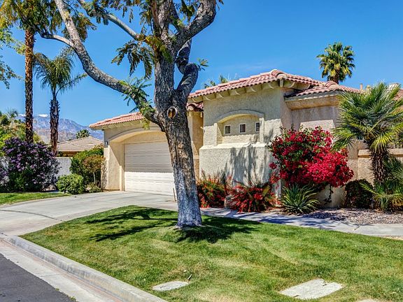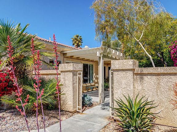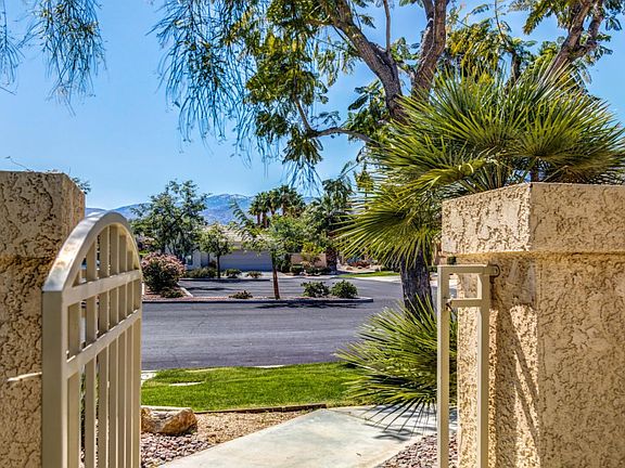 This lovely home offers a private courtyard entrance leading to a bright spacious open floorplan, featuring updated bathrooms and kitchen, high ceilings with dimmable recessed lighting, ceiling fans, newer flooring, custom window coverings, and 2 new AC units! The interior cul-de-sac location offers both privacy and beautiful mountain views. In addition, there are three relaxing outdoor living areas with covered patios, This desirable, well-located gated community offers two heated pools, spas, sauna and includes front yard maintenance for only $270/month. Just minutes to shopping, dining, entertainment, and hospital. A must see!