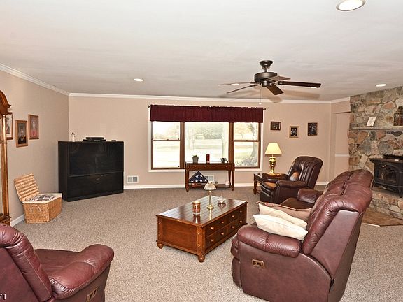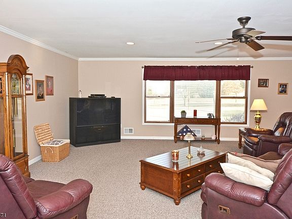 Beautiful custom sprawling ranch situated on a level 1.3 acre lot on the outskirts of historic Flemington. Flagstone walkway leads to foyer entry that opens to living room and leads to an expansive FR with stone fireplace & insert. Newer center island kitchen features glass backsplash, granite counters and SS appliances. Other features include high hat lighting, skylight, ceiling fans, wood floors & crown and chair rail moldings. Light filled breakfast room overlooks a corner solarium with skylight. Formal DR features triple slider leading to back deck that overlooks a private backyard. Bedroom wing features a spacious master suite with newer bath and triple closet. 2 additional BRs and bath complete that wing. Finished basement with den and full bath features a steam shower. Paved driveway with 4-car garage.