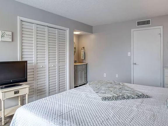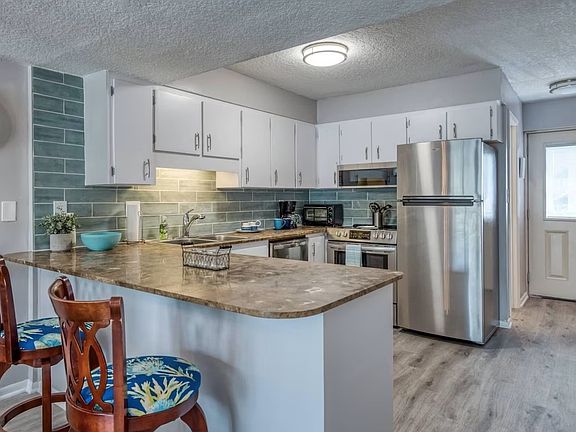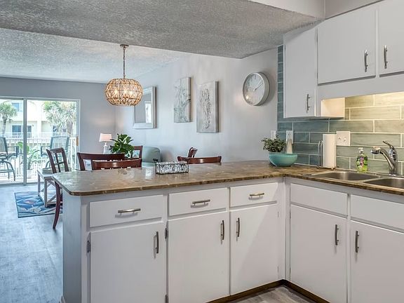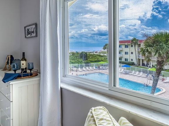 Enjoy breathtaking ocean views all day in a meticulously appointed condo nestled right in the heart of St. Augustine Beach! Gorgeous natural dunes and white sandy beach are just steps away from your balcony with access downstairs across manicured landscaping to a private beach entrance. The kids will love the huge pool which sits on the lawn just out from the balcony. "Sandy Shores" is tastefully decorated with soft and fun beach decor, perfect for unwinding from the busyness of life. Upstairs, enjoy a large Master bedroom with ocean view, a second bedroom furnished with queen and twin beds, and a full bathroom off the hall. The bedrooms are outfitted with fresh, crisp linens, and the bathrooms with soft, white towels. Bring along your tennis racquets to enjoy the courts on site. Have fun in the sun at the beach and pool all day and come back to your cool condo to cook up dinner in the fully stocked kitchen, take in the night views from the balcony, or watch a movie with the family.