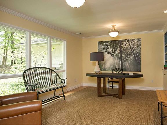 Retro loft like Contemporary situated on 11+ acres offering total privacy and complete serenity. The sleek open space w/soaring ceilings is perfect for large works of art. Composed of stone, glass and shingle this turn key immaculate house is all about todays buyer. Two stone fireplaces, 2 master bedrooms en suite, both with their own private terraces, 2 guest bedrooms, library and an enormous basement for gym, media room, etc. A great location off a scenic unpaved road minutes to everywhere you want to be! 24 hours notice required for accompanied showings.