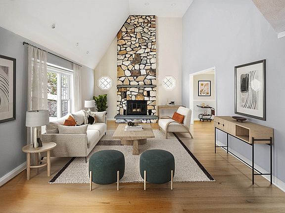 This stunning 4-bedroom, 4-bath modern home offers the perfect blend of luxury and tranquility. Featuring soaring vaulted ceilings, a floor-to-ceiling fireplace and an open-concept design, this spacious home is bathed in natural beauty. The gourmet kitchen is pristine and boasts high-end appliances, quartz countertops, a prep sink and secondary dishwasher, and a large island—ideal for entertaining.! Hardwood floors highlight the main living area and bedrooms, working as a perfect offset to all the natural light this home enjoys. There's a cozy den with a wet bar/entertainment area plus a huge family room in the lower level. The primary suite is a private retreat with a spa-like bath and walk-in closet. Step outside to a serene backyard oasis with a large deck, set against pristine conservation land for ultimate privacy. A rare find combining contemporary elegance with nature’s beauty!