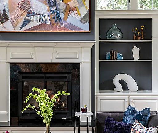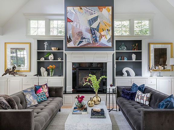 - Living Room: Cathedral Ceiling, Living Room, Bay/Bow Windows, Built-Ins, Fireplace, Recessed Lighting, Ceiling Fan, View