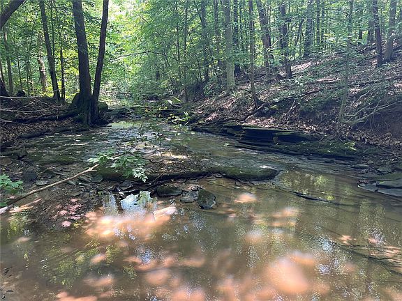 Discover your perfect retreat on this secluded 40-acre property at the end of a quiet dead-end road. Surrounded by lush, wooded hills and a picturesque rock-bottom creek, this serene location offers unmatched tranquility. The cozy home features a vaulted ceiling living room with a stone fireplace that opens to the kitchen, a full bath, and a versatile small bedroom or office. Upstairs, a loft overlooks the living room, leading to a peaceful larger bedroom. The unfinished walkout basement offers potential for customization.