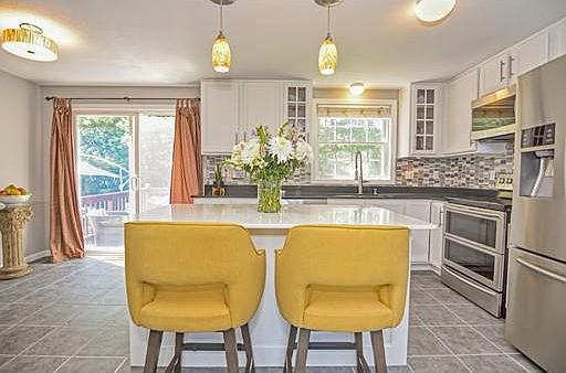- Kit Dscrp: Countertops - Stone/Granite/Solid, Flooring - Stone/Ceramic Tile, Kitchen Island, Stainless Steel Appliances