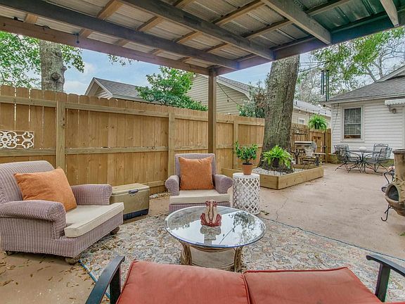 This home is adorable and brings the charm of New Orleans-style architecture right here to Pensacola! Nestled just minutes from the Country Club and Downtown Pensacola, this home offers a perfect blend of character and includes a brand-new roof installed in 2025! As you arrive, you’ll be greeted by the covered front porch, the ideal spot to relax in your rocking chair while enjoying your morning coffee. Alternatively, you can access the home through the back alley, where you'll find a one-car garage and an open patio area. This special backyard oasis features a covered gazebo, an oak tree, and plenty of space to unwind, entertain, or fire up the grill. Step inside, and you’ll be welcomed into the living and dining area, which showcases dental crown molding, high ceilings, and wood-look flooring. This home features two bedrooms, each with en-suite bathrooms. The front bedroom offers wood-look flooring, a ceiling fan, a private bath with a tub/shower combo, a single vanity, a linen closet, and tile flooring. The second bedroom, located off the dining area, is even more spacious and could serve as the primary suite, complete with wood-look flooring, a walk-in closet, and direct access to the patio. Its en-suite bathroom features a walk-in shower, tile flooring, and a double vanity sink. In the main living area, French doors lead to a side yard. The kitchen features a gas stove, granite countertops, an island, abundant cabinet space, and a built-in bar area for your coffee station or wine collection. For added convenience, the laundry area is located just off the kitchen. Additionally, there’s a dedicated office space with shelving—perfect for organizing office supplies, memorabilia, or extra storage. You’ll find access to both the one-car garage and the patio from the office area, making this home as functional as it is charming. Take the opportunity to make this delightful home yours.