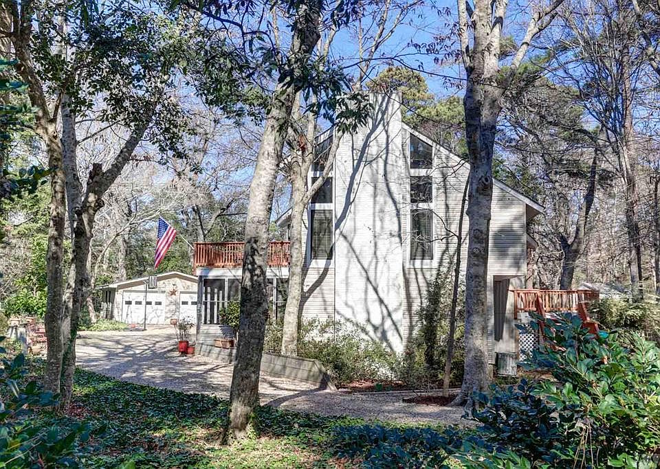 Southern Shores maritime forest setting, just minutes to the beach, shopping and restaurants. Lovingly maintained 4 bedroom, plus loft home with separate two car garage . This coastal home features wood floors, three bedrooms and two baths on the main floor, great room with wood burning fireplace, kitchen, laundry and screened porch.. The second floor boasts cathedral/beamed ceilings, wood floors, wood burning fireplace , main bedroom and bath and a loft bedroom. Community boat marina, parks, tennis, paths and sound access. Updates include: New Roof 2017, Septic Field replaced 2019