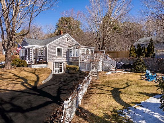 Walk steps from this casually elegant home down to the Frisbee's Wharf on Pepperrell Cove, offering a public boat ramp, transient slips and moorings, for water lovers of all kinds. Located next to the docks is the famed Pepperrell Cove Restaurant, Provisions general store, and ice cream shop. Upon arriving home, you're greeted by a pergola and fence wrapped with vines bearing grape bunches throughout the summer season. The front lawn is the ideal entertaining spot with a stone circle firepit and up to the front deck to enjoy the cove views. Enter into the sunroom and stunning kitchen with quartz counters, island with seating and cabinets for pantry storage. Adjacent to the kitchen is the bright living room with shiplap accents and a propane stove. Connected to both the living room and kitchen is the dining room with vertical wood paneling and corner cupboards. Finishing this level are the three bedrooms, one with an attached half bath and a full bath in the hall. There is potential to add a primary suite on the upper floor, taking advantage of the views to the water. The lower level offers a spacious bonus room, a laundry room and a front to back mudroom/work shop that has previously been used as a 3 car, tandem, garage but now has a door for walk-out access to the driveway. The upper lawn area has rock gardens and is another spot for entertaining with beautiful partial views to where the Piscataqua River meets the Atlantic Ocean.