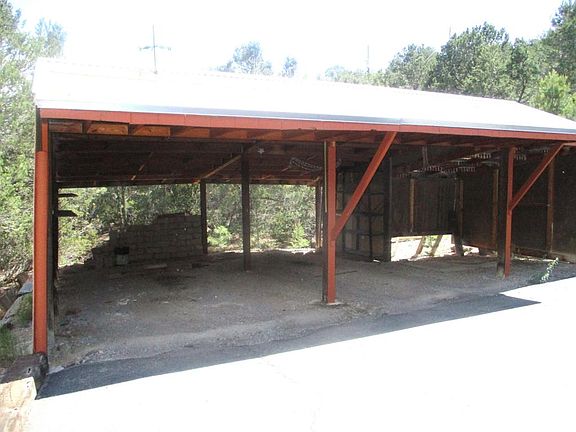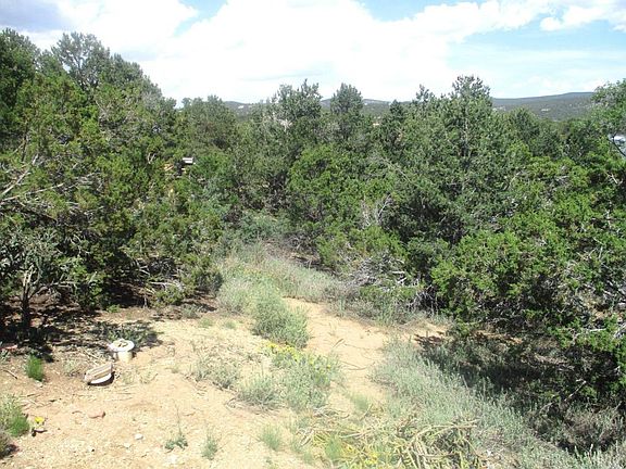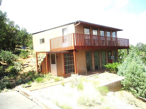 A unique home in a gorgeous setting, secluded and quiet, home is bermed on 3 sides, constructed with foam forms and faces south for maximum winter sun, making it exceptionally energy efficient. Setting is heavily wooded but home is on a rise and has glorious views to the east and south. A separate one-room structure has power but no water and could be used as a rustic guest house. Home is all-electric and served by Tijeras water system. Cooling is by window unit, heating is baseboard and passive solar. Brick floors down, carpet upstairs, spiral staircase to the upper floor & 2 bedrooms and a Jack & Jill bathroom. Downstairs is a great room, full bath and laundry room which also has a pantry or workshop area. Accommodation for wood or pellet stove exists but neither is there now.