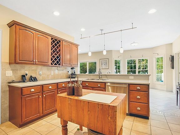 This well-maintained custom-built ranch on a cul-de-sac comes w/ HIGH END amenities including an on demand Buderus water heater, an EcoSmarte heated inground pool, patio w/ fire pit, frog pond w/ waterfall, rose & organic garden. In addition to forced hot air there are radiant heated flrs where tiled, & in both basement & garage. A formal entrance & french drs open to an office which leads into a spacious living rm w/ a stone gas-fueled fireplace. Sunlight comes in through the dining rm bow window, & the sliding glass drs in the living rm & sunrm which leads to an expansive deck. The kitchen is large w/ ample Corian counter space, gas stove, stainls steel appl., cherry cabinets & breakfast bar. Convenient main level laundry rm/ mud rm, garage access, & guest 1/2 bath. Two bedrms, 2 addit. baths, & a premier primary w/ en-suite, walk-in & a tiled glass block shower complete the 1st flr. The HUGE walk out basement has massive potential, & leads to a 1 bay garage for pool & yard supplies.
