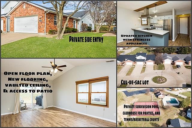 Easy living!! Move right into this adorable 2 bed/2 bath cul-de-sac condo with attached 2 car garage. Condo conveniently located just 20 minutes to downtown STL with easy interstate access and commutes. Enjoy resort-style living with access to subdivision clubhouse, pool, and tennis courts. Kitchen boasts new range hood, modern 2-tone painted cabinets, stainless appliances, and tile backsplash. Fall in love with the new wood-look laminate flooring throughout the entry, kitchen and living room, which leads to patio overlooking common ground. Master suite offers attached master bath. Laundry room includes washer and dryer. Association fee is $235/month and includes water, sewer, maintenance of all grounds (trees, shrubs, grass, streets, driveways, and sidewalks) as well as building exterior (windows, doors, roofs, siding, and outdoor lights), snow plowing (private streets) and insurance coverage of building exteriors.