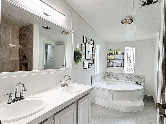 This STUNNING 3-bedroom, 2-bathroom residence features a BRAND NEW roof, fresh interior paint, and NEW vinyl flooring throughout. Enjoy beautifully remodeled showers, a revamped master closet, and a COMPLETELY UPDATED second bathroom.SPACIOUS and filled with MODERN touches, this home is located in a family-friendly ALL AGE community with a pool, serene lake views, and more! Monthly fee includes land lease, trash removal, lawn maintenance, and cable, providing a hassle-free living experience. Conveniently situated next to two large plazas with a variety of stores and less than a 5-minute to a grocery store, it's the perfect blend of comfort and convenience! TURNKEY!