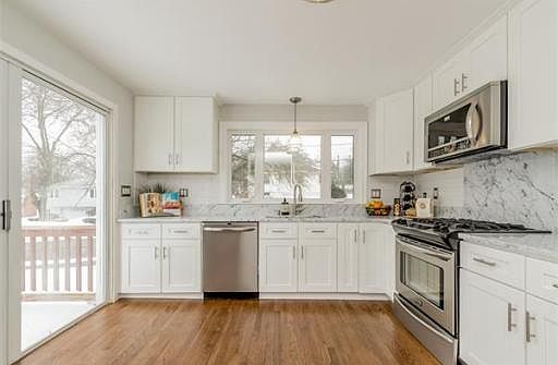 Spacious Ranch with three bedrooms and 1.5 baths. Large Living room with fireplace. New kitchen with marble counters, stainless appliances, and White Cabinets. Finished basement with second fireplace and bar, perfect for entertaining. Sliders to deck, new baths. One car garage under and good size back yard with mature plantings on a corner lot..
