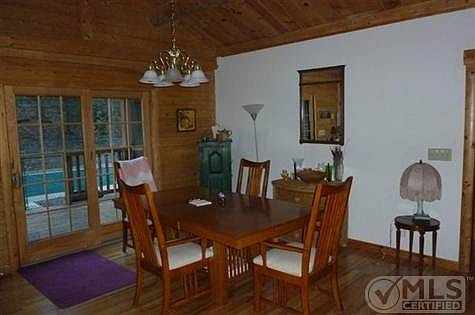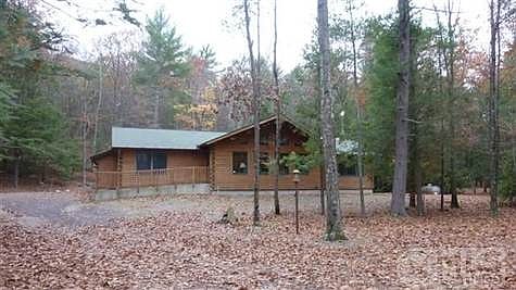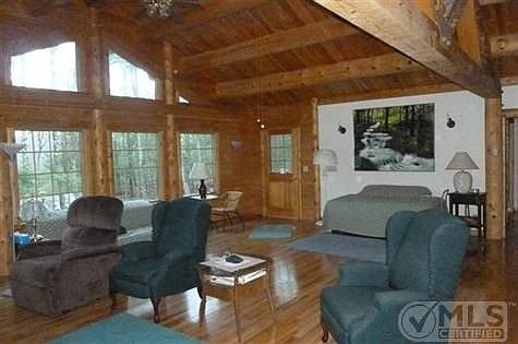 Open, spacious, light -- it's a modern log home featuring vaulted ceilings with skylights and a large "great room" that surrounds your stone fireplace! A wall of windows invites this magical woodland setting (almost 6 acres!) in. This is one of Woodstock's most desirable roads and offers pristine nature, quiet and seclusion. Sited down a long, winding country drive, the house is totally invisible from the road and includes 3 bedrooms and 2 full baths with a den.