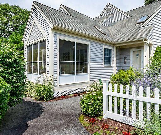 Set amongst lush vegetation, this lovely Windchime home provides both exceptional privacy and beautiful garden views. The sunny, cathedral-ceilinged living space offers a fireplaced living room, primary bedroom suite, and two baths. Off the rear of this home, French doors lead to a quaint ''beacon-hill'' stone patio and garden. The airy eat-in-kitchen boasts natural tone wood cabinets, a center island and granite counter tops. This bright kitchen offers access to a cozy screen porch for morning coffee or reading your favorite novel, and can be converted to a sunroom. An open staircase off the foyer leads to a second bedroom and bath, and a spacious loft provides area for a home office or den. This home has a full well-maintained un-finished basement. Windchime is serenely beautiful, with mature trees and plantings and picturesque Nantucket style architecture. It is near-by salt-water beaches, walking trails, luxury shopping, and exceptional restaurants. Access to the town's boat ramp is just down the road for boating, kayaking, and water sports on Popponesset Bay and Nantucket Sound. Rather stay on property? Easy access to Windchime's heated pool and tennis/pickleball courts Don't miss this wonderful opportunity to live and play at Windchime!