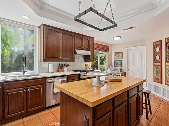 The home features a chef's kitchen with a large center island, high-end stainless steel appliances, and open-concept living areas that flow effortlessly to the wraparound patio and private landscaped backyard ideal for relaxing or entertaining.