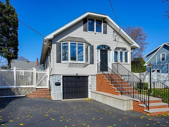 Picture perfect Bungalow with a first floor bedroom and bath, one-car garage, landscaped lot, and fully fenced back yard. The adorable sunroom opens into a good size living room with bow window. Dining room has a chandelier and built-in china cabinet. Updated kitchen with tile floor has access to deck and fully-fenced backyard with storage shed. Den/family room is open to the kitchen and has stairs both up and down. First floor bedroom with double closet. First floor full bath with tub and shower. Second floor has an office, a spacious bonus room, and another bedroom. Lower level has plenty of storage, a paneled family or game room with built-ins, a laundry room, utility room, and a garage. Updated windows throughout. Plenty of parking in the spacious driveway. Beautifully landscaped yard with sprinkler system. Convenient to all that Stoneham has to offer. Welcome home!