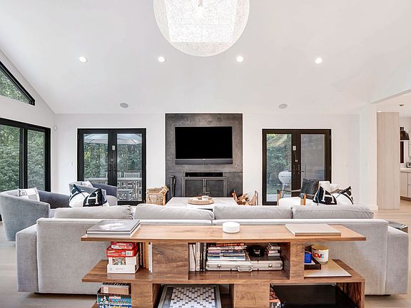 Discover the perfect blend of modern design and Hamptons tranquility. Privately set on 1.91 +/- acres at the end of a quiet cul-de-sac bordering a reserve, this home was newly rebuilt in 2017 and is effortlessly turnkey ready. Designed for both luxury and leisure, this light-filled home features soaring ceilings and an open concept layout that seamlessly connects indoor and outdoor living. The main level showcases a welcoming foyer, spacious living room with wood burning fireplace, an expansive dining area, beautiful white oak floors, and large chef's kitchen. The kitchen is fully equipped with a Sub-Zero refrigerator, Wolf stove, pot filler, full size wine and beverage cooler and generous center island with plenty of storage and counter space. Multiple glass sliding doors in the living area give access to the extensive decking and patios surrounding the heated gunite saltwater pool and spa. A spectacular primary en-suite thoughtfully positioned on this floor boasts oversized windows with motorized black-out shades and two walk-in closets. The en-suite bathroom evokes a spa experience with a steam shower, soaking tub, water closet and double oversized vanities. Two additional en-suite guest bedrooms one including a deck to the yard and a powder room complete the main floor. Upstairs offers a second primary en-suite bedroom with double vanity, soaking tub, walk-in shower, private terrace and versatile bonus room, ideal for an office, gym, or media space. The bathroom includes two vanities, soaking tub and walk-in shower. The finished lower level provides additional living and recreation areas including a fitness zone, game room, laundry, bonus space, full bath, with additional walk-out stairs to yard. Set against a backdrop of peaceful landscapes, just minutes from East Hampton Village and Sag Harbor, this move-in ready modern retreat combines contemporary design, privacy, and resort-style living--an exceptional Hamptons escape ready to be enjoyed year-round.