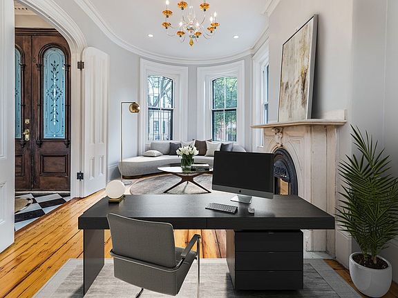 This grand single family brownstone offers a flexible and spacious layout, thoughtful amenities & original detail. On parlor level, find soaring ceilings & marble fireplaces in both the bright front-facing office and the formal dining room w/ fully applianced butler's pantry. Kitchen has massive island, custom dining area & wall of windows alongside French doors to lovely bluestone patio for perfect indoor/outdoor living, dining & entertaining. Impressive owner's floor has ornate bedroom w/ fireplace plus other rare amenities like library w/ original moldings, 2 walk-in closets, stone shower & jacuzzi. Fourth floor has 3 bedrooms, one with walk in closet and en suite bath. Skylit top floor family room or guest suite has applianced wet bar & full staircase to private roof deck. Additional features/improvements: full repointing & exterior restoration in 2018, radiant heat floors, 2 laundry rooms and security system/intercom. Live moments from heart of the city on scenic Rutland Square!