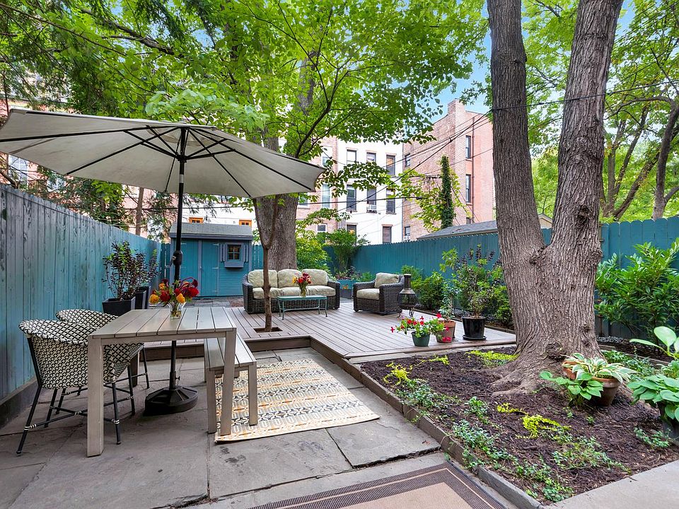 Unique opportunity to own a spectacular 2 bed 1.5 bath ground floor duplex residence with a1,320 square foot landscaped garden located on the corner of South Portland Ave and Dekalb Ave, right across from Fort Greene Park. With common charges and real estate taxes totaling$1,250 per month, this is one of the most affordable homes in Fort Greene. Leading off a row of historic Italianate Brownstones with majestic Plane trees lining landmarked South Portland Avenue, this 1,543 square-foot condominium home welcomes you into a spacious living space framed by a natural dining area, oversized windows, and an open kitchen with glass door leading to the sprawling garden. The great room's dimensions, delicate ceiling crown moldings, red oak flooring with dark contour lines, a wood burning fireplace with a luxurious antique white marble mantel, and a modern kitchen create a warm and lavish living experience for all. The chef's kitchen boasts espresso granite counters, 36" high wood cabinets for ample storage space, a large sink, and stainless-steel appliances including a large Liebherr refrigerator, GE Profile oven range and a double mode Fisher & Paykel dishwasher. A glass windowed door opens onto the recently renovated 1,320sf garden / yard fully equipped with a large deck with seating area, BBQ station, new wood-fence all around the perimeter, numerous planters and flower beds, two tall Plane trees, and a 60 square foot shed in the back. This exquisite amenity is a true gem for entertaining all your friends in total safety and/or enjoying your latent green thumb. In the front of the main level is a large bedroom with three separate closets and two windows inviting light all day long. The bathroom is fully equipped with Toto toilet system, deep soaking Jacuzzi bath, separate shower stall with rain shower head, towel heaters, all wrapped in Calacatta marble and recess lighting. The lower level offers a gracious master bedroom with walls of customized millwork closets, warm natural stone flooring with radiant heat system, a separate half bath, full-size washer/dryer, and an exterior stair leading to the garden. The home is equipped with a two-zone, three wall-mounted AC split system units, and a video-voice intercom on each level. Please note that while this unit is designed and used as a two-bedroom, it is considered a one-bedroom plus recreation room per offering plan. This boutique condo building is comprised of 5 units and offers unbelievably low common charges and real estate taxes. The location is superb on beautiful landmarked South Portland Avenue between Dekalb and Lafayette Avenues. Across the street is Fort Greene Park with its tennis and basketball courts, playgrounds, resting benches, popular Saturday farmer's market, and restaurants such as Paulette's Caf , Walter's, and Evelina. Near Barclay's center, BAM, and numerous subway lines for a quick hop to Manhattan.
