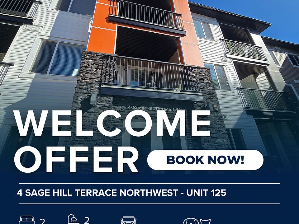 Fantastic 2 Beds+Den, 2 Baths Apartment/Condo | Up to 2 Pets Allowed. 20lbs Max | Monthly Rent for 12 Month Term Includes Welcome Offer Welcome to your new home at 4 Sage Hill Terrace Northwest - Unit 125 - Unit 125 a modern and well-maintained 2 beds / 2 baths / Apartment/Condo offering comfort, space, and convenience. Ideally located close to shopping, schools, parks, and transit. SHOWINGS: Conducted in an open-house format book your appointment today! Prices, availability, and promotions are subject to change without notice. PROPERTY DETAILS: - Furnished or Unfurnished: Unfurnished - Pets: Up to 2 Pets Allowed (2 cats, 1 dog/1 cat, or 1 dog). 20lbs Max. $50 Monthly Fee - Smoking: Non- Smoking - Parking: Underground - Storage Included: No - Laundry: In- Suite Laundry - Management Type: Full Management - Lease Term: Long Term UNIT FEATURES: - Living Space:Open-concept living room layout, perfect for relaxing or entertaining featuring: Large Space,Large windows,High Ceilings - Kitchen: Sleek and modern kitchen with appliances featuring: Pantry,Double Sink,Plenty of cabinet storage,Stainless steel appliances,Open concept kitchen - Dining Space: Open-concept design flowing into the living space, perfect for entertaining - Bedrooms: 2 Bedrooms with some bedrooms featuring Large Windows,Attached full bathroom,Walk-in closet - Window Coverings: Includes window coverings for privacy and light control UTILITIES: - Utilities Included: Heat, Water Here's a helpful tool you can use to get a rough estimate of utility costs. LOCATION HIGHLIGHTS: - Outdoor Living: Nearby Parks, Pathways, Greenspaces - Transit & Access: Transit Lines / Major Roads Nearby - Family Friendly: Close to Schools, Childcare, Rec Centres - Local Conveniences: Groceries, Shops, Restaurants, Services Nearby Don't wait properties like this don't last long. Welcome Offer: The listed rent already includes a special savings equal to one month's rent, spread evenly across your 12-month lease. Available on new 12-month leases only.