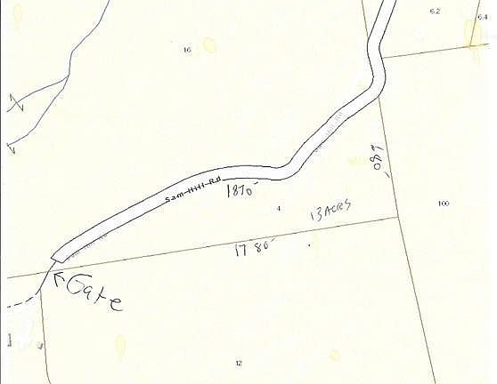 A beautiful 13 acre parcel on Sam Hill Road in the special small town of Worthington. Land is on a private gravel road with over 1,800 feet of frontage. This allows for the possibility of multiple lots or the ultimate in privacy with wide borders. The land abuts protected conservation land. Land is wooded with rolling hills but plenty of level land for a home site. The land starts at "For Sale" sign on left side of road and runs all the way to end of road where gate is located. Stone walls mark borders.