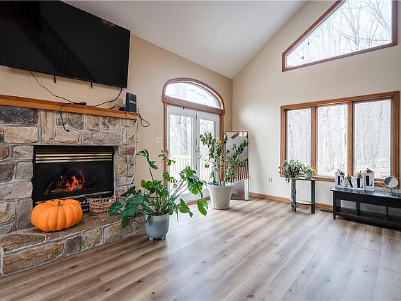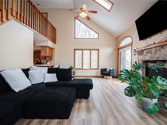Welcome to your mountain retreat! This captivating 4-bedroom, 2 1/2-bath home is the epitome of cozy mountain living, perfect for both year-round family residence or an idyllic vacation getaway. Nestled in the heart of nature, this woodsy two-story abode offers a perfect blend of comfort and rustic charm. As you approach, the expansive front and rear decks invite you to soak in the breathtaking views that surround you. The outdoors seamlessly blends with the indoors through sliders leading to the deck, while large windows frame nature's beauty. Step into this truly open concept space, and you'll be greeted by the vaulted great room, adorned with a striking stone fireplace. Skylights overlook the open stairway, filling the home with natural light and enhancing its airy feel. The clean and maintenance-free laminate floors lead you to a well-appointed, wide-open kitchen that's perfect for entertaining. The kitchen features ample space for culinary creativity and a pantry for added convenience. This floor also offers 2 bedrooms and a 2nd family room/rec room. The 2nd floor boasts a Primary Bedroom Suite and 1 additional bedroom with loft area. This home is situated in an amenity-filled community, offering a range of resort-style recreational options for residents. From outdoor adventures to community gatherings, this locale provides the perfect backdrop for a vibrant and fulfilling lifestyle