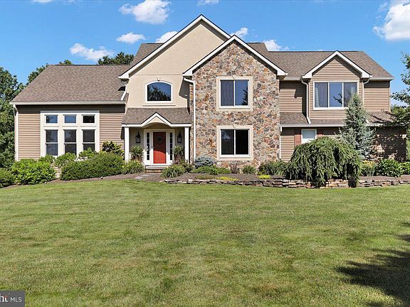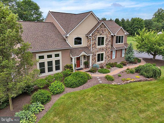 This luxuriously appointed and thoughtfully updated home is situated on a serene and private 2 acre lot in a highly sought after enclave in Amity Township. The two story foyer features hard wood flooring and open staircase with wrought iron railings leading to the second floor. On the right, as you enter the home, is a generously sized dining room with crown molding that flows through the home. The updated kitchen is customized and spacious with high end appliances and finishes. The large dining area off the kitchen leads directly out to the huge covered patio. The eat in kitchen flows into the stunning family room with it's high ceilings, huge windows, beautiful fireplace and gorgeous hardwood flooring. Continuing the smart and easy floor plan, you'll also find a large private room in the front of the home that the current owners use as an office. It could also be a play room, library or formal living room. Completing the first floor is a two car garage which is attached to the home by a spacious mud room/laundry room. This home is absolutely move-in ready with tasteful, upscale decor and finishes. Upstairs you'll find a spacious primary bedroom with built in window seating and a fabulous remodeled bath with soaking tub, radiant heated floors, heated towel rack, water closet, remodeled shower and high end finishes. It's definitely got the wow factor! The rest of the second floor features 3 generously sized secondary bedrooms and beautiful hall bath. Moving down to the lower level of the home, you'll find a huge family/rec room with built ins and a stunning corner fireplace. There is also a beautiful, spacious full bath with shower on this level. The outside entrance makes this an ideal space for entertaining. Speaking of entertaining.... the outdoor space is what takes this home from gorgeous to spectacular!! The backyard Oasis consists of a gated Fronheiser inground pool with diving board. Mature landscaping surrounding this part of the yard makes this area completely private. Plenty of finished space around the pool allows for entertaining options galore. The covered patio (26x22) links the home to the pool and provides shade with more entertaining space. This home truly has it all!!