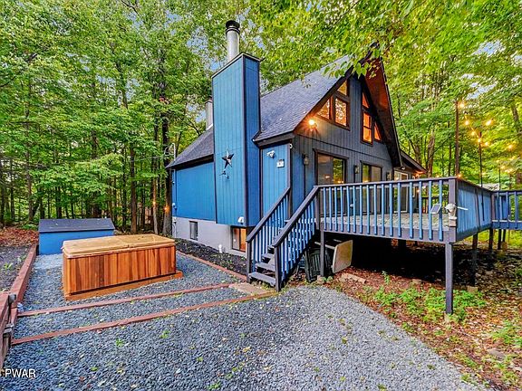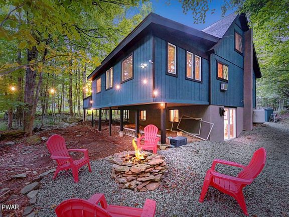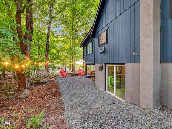 Located in The Hideout, a four-season amenity filled community in The Northern Poconos, just two hours from the NY, NJ and Philly metro areas. Nestled on a private corner lot, this chalet home has been completely renovated from top to bottom and hasn't been lived in since the renovation, and it has a brand new roof! Featuring 4 bedrooms and 2.5 bathrooms, the home boasts a spacious main living area with high ceilings and an inviting loft above. The brand-new kitchen, complete with stainless steel appliances, is complemented by knotty pine ceilings that extends to the cozy gathering space with brick fireplace. Also on this level is a large functional room which can be used as a living room or dining room, and the sliding doors are for added versatility--open them up for an expansive space or close them to create a private 5th bedroom or office.Both main-level bedrooms showcase beautiful knotty pine ceilings, adding warmth and character. The walk-out lower level offers a large recreation room, a fourth bedroom, and a full bathroom, as well as a brand-new washer and dryer for added convenience.Step outside to enjoy the fresh gravel surroundings, relax on the deck, or gather around the firepit in the backyard. A large shed and ample storage for firewood ensure everything is in its place. Plus, this charming chalet comes fully furnished with brand new furniture--ready for you to move in and enjoy! Conveniently located near the ''Stock Farm'' gate for easy access to Honesdale, a cool historic town with shopping, restaurants and breweries.