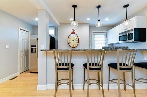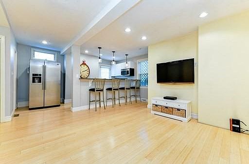 Opportunity knocks! Welcome to Precinct One, Dedham's historic and premiere location. A short walk to the town center amenities, theatre, library, shops and restaurants. This unit is on the 1st level. Front porch was just updated. The original front door greets you and just down the hall you enter into this renovated condo unit. Bright and cheerful bamboo flooring throughout. The quaint living / tv room is open into the kitchen. White cabinets and stainless steel appliances. Fantastic granite counters with breakfast bar area with seating. The door off of the kitchen steps out to a lovely side yard with private deck for grilling and outdoor entertainment. One bedroom, bathroom and several closets on this level. The finished space downstairs offers a 2nd bedroom with closet. Could be used as a home office, gym or a nice bonus space to use however you see fit. Well managed with healthy reserves. Off street tandem parking for 2. Welcome home!