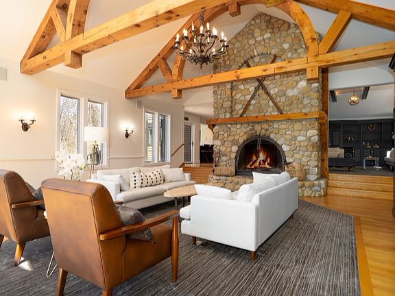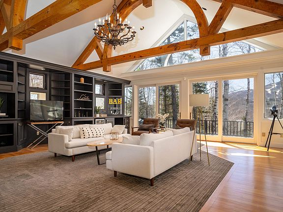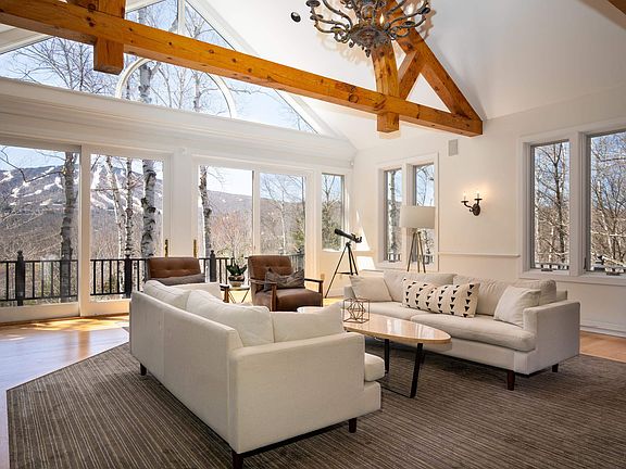Nestled among white birch trees within the coveted High Meadow enclave of Stratton Resort, this home boasts breathtaking vistas of the mountain, paired with the convenience of winter shuttle access to the Base Lodge. Recently renovated, this property epitomizes turnkey elegance and tranquility.  Step into the post and beam great room, where walls of windows flood the space with natural light. An impressive stone fireplace sets the stage for cozy après-ski gatherings, while a convenient wet bar adds to the indulgent atmosphere. A second gathering room, featuring a charming brick hearth, along with a lower level game room with sauna, offer coveted additional living spaces for your mountain sanctuary.  In the kitchen, unleash your culinary prowess with high-end appliances including a Wolf gas range and Sub-Zero refrigerator, all centered around a delightful breakfast bar.  The main level bedroom beckons with its own cozy fireplace, access to the wraparound deck, and a beautifully tiled bath. Upstairs discover the primary suite, boasting vaulted ceilings, panoramic trail views, a walk-in cedar closet, and a luxurious soaking tub. Two additional bedrooms, a beautifully updated bath, and a convenient laundry area complete the upper level. Effortlessly organize your winter gear in the mudroom and 2-car garage. Discover the pinnacle of alpine living at the Stratton Mountain Resort.