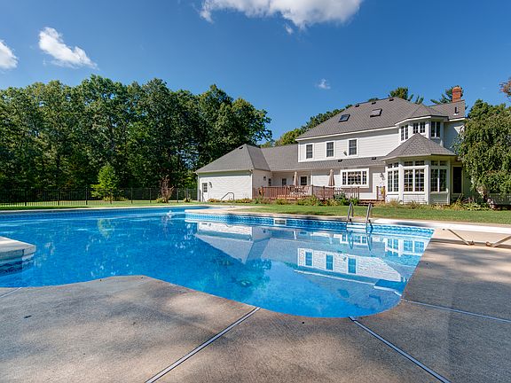Private setting access to golf course. Custom w/9' ceiling 1st floor, cath. ceiling fam. rm w/wall stone finished pass thru fireplace to kitchen/din. rm. Loaded with custom Anderson glass windows many 6' tall, Kit. features full appliance package plus Viking wine refrigerator, curve island seats for six & knockout window. 1st flr. den. Turret style sun-room w/casements floor to ceiling. Half bath with laundry closet. Mudrm entry way from porch/front/garage offers double size coat closet plus double pantry closet. 2nd floor has 3 brs including master w/suite with jaccuzz unt, 5' shower w/5 shower heads & turret design casements above tub. Office w/oval window overlooking golf course. 4th bedrm on 3rd level with walk-in closet. 20x40 w/12X18 L. Pool plumbed for heater. Professional landscaped 54 sprinkler heads. Huge deck with insert Jacuzzi.3 Car garage with extra ceiling height. 40 year slate design arch.shingle. Generator switch system. 1200sf storage in LL. Abuts Conservation Land.