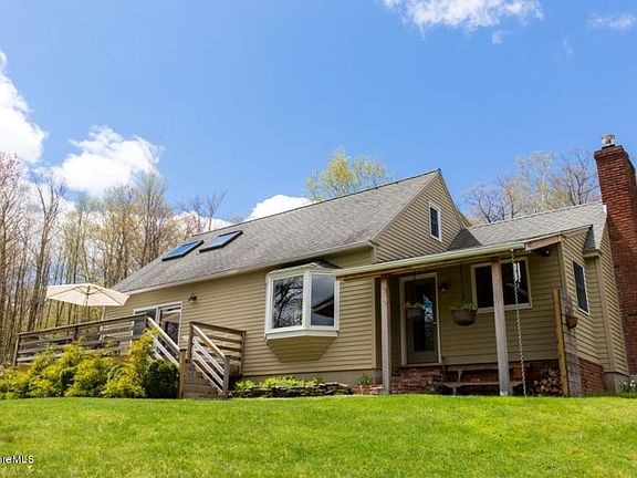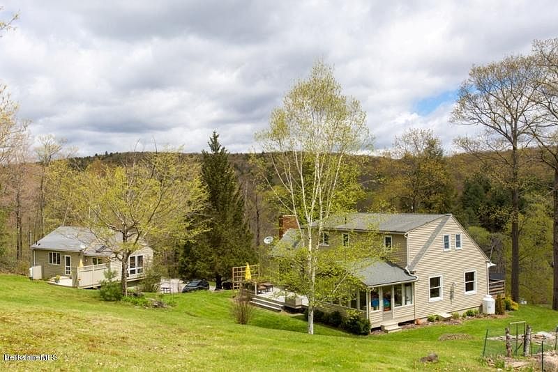 This beautifully updated, impeccable home sits on an expansive bucolic hillside, with private carriage house apartment above three-car detached garage. Main house features abundant natural light, rustic accents, wood & bamboo floors throughout. Inviting outdoor spaces provide lovely mountain & garden views. Front-to back living room with pellet stove opens to deck on one side, & three-season porch on the other. Delightful kitchen opens to dining room, den, & rear deck. Lovely bedrooms & beautiful bathrooms feature stone & marble tile. Bright, spacious one-bedroom apartment above garage has an established rental history. 13 peaceful acres with trails to a fire pit at the top of the hill. Half mile walk to gorgeous Goose Pond, and minutes to the best of the Berkshires.