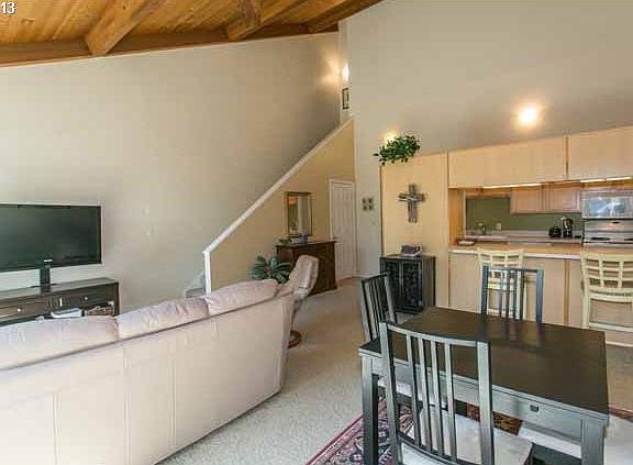 In Building "V". Nicely updated condo that is move-in ready & includes all appliances. Great open floor plan with vaulted ceilings & lots of windows. Spacious Living Room with slider to deck looking out to a park like setting. Upstairs Bedroom & Bath with beautiful tile shower/tub surround & counters. Main floor bedroom/office & full bath. EZ access to I-5, 217 bus line & PCC.