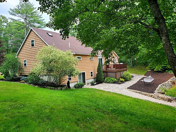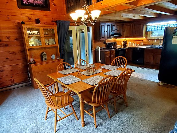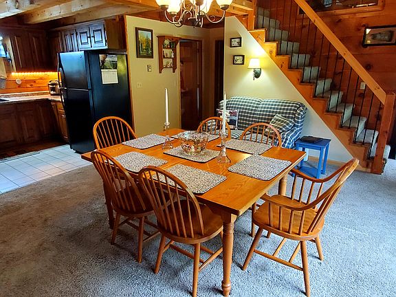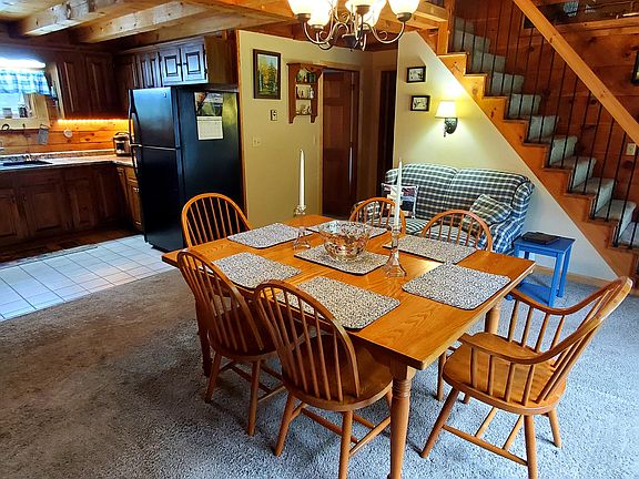 This is NOT your typical Cape Cod-style home. Step inside and be prepared to experience the 'feel' of a real log cabin. With plenty of knotty pine ship-lap walls throughout, this home provides a coziness not available in traditionally-finished 'blank walls' of so many of today's houses. The dining room with cathedral ceiling is spacious and opens to the fully-applianced kitchen. There are two bedrooms and a completely updated/upgraded full bath on this level, as well. Upstairs enjoy a wide-open feeling in your loft office-study. In addition, there is a huge closet and the primary bedroom with lots of storage. On the lower level, RELAX in the oversized living room, complete with custom-made bar with live-edge top and a laundry room/utility room. From the living room, through sliding glass doors, enjoy the stone patio and open yard with fire pit. There is also a storage building and a unique playhouse/storage/dog kennel building. Back to the main level, step into a breezeway with access to the attached two-car garage, and a choice of entering the front yard through sliding glass doors with its beautiful landscaping, or through another set of sliding glass doors onto the spacious open deck - with composite decking and structured to support a hot tub, too! Close to hiking trails and the lakes, this home sits on three acres and is a corner lot, right at the school bus stop! So pack up your furnishings and make this unique house YOUR HOME!