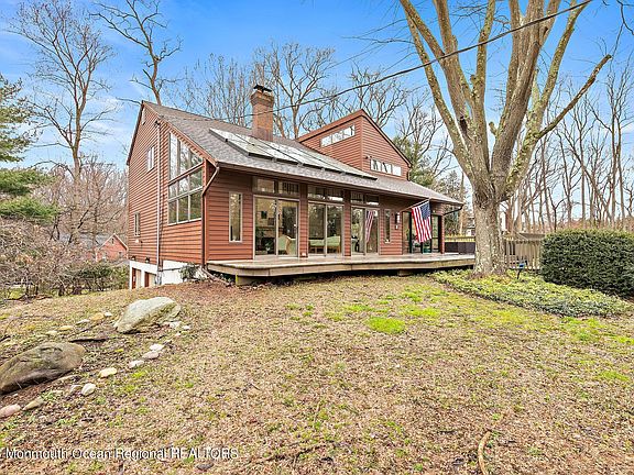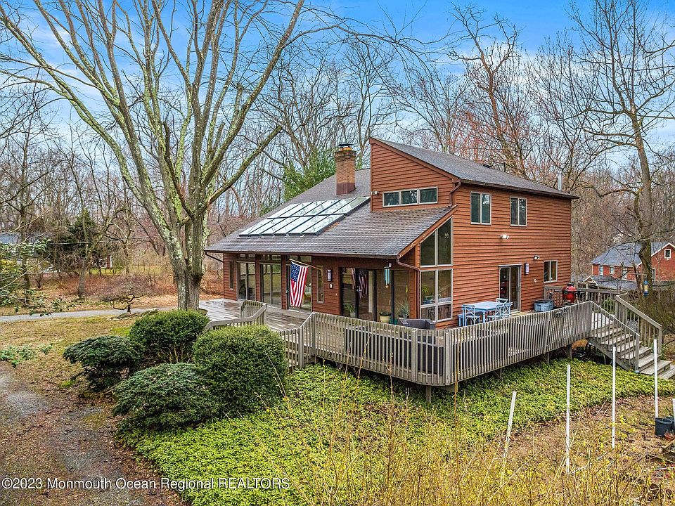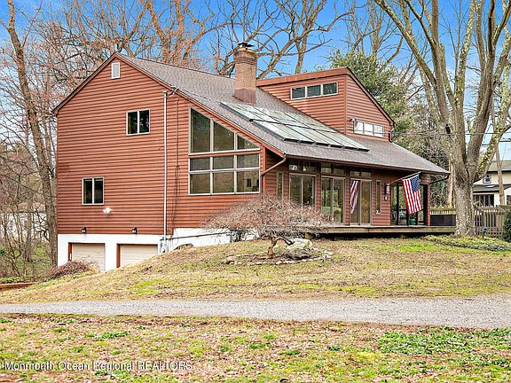 Welcome to the perfect suburban retreat! From the moment you enter 'The Lane' you'll immediately feel the essence of Holmdel's enchantment. Tucked away on a private road, this tranquil and gorgeous three bedroom mid century modern home is the ideal escape for those who want to stay connected but still enjoy peace and serenity. Enjoy morning coffee in the kitchen, dining room or on the oversized outdoor deck surrounded by the healing powers of nature. The naturally lit and airy living room is adorned with stunning brick work, cozy wood burning fireplace and newer skylights. With a Contemporary and efficient architectural design, every detail was carefully considered. Designed with energy savings in mind, this home is equipped with a cost efficient geothermal heating and cooling system. The home has a whole-house triple-water filtration, plus Reverse Osmosis for the kitchen sink fountain. List of additional updates include: all new switches and electrical outlets, Veluxe skylights with transferrable warranty, a newer roof, water heater, HVAC system, and exterior retaining wall. Close proximity to shops, restaurants, and Holmdel's famous parks & trails. Public transportation and the Garden State Parkway is nearby, ensuring effortless commuting to NYC.